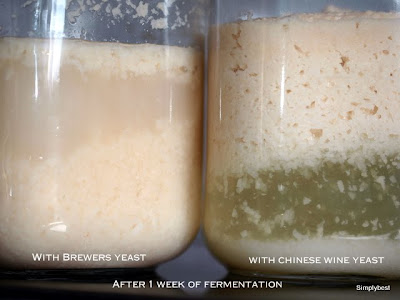 She usually start when one of my aunts or relatives gets pregnant. She will steam the rice in a huge bamboo basket and then the rice would have to be cooled before wine yeast is added, then the mixture would be carefully loaded into a huge earthen 'jug'. This jug (with a volume of at least 50 litres) will then be hidden in a dark corner of the house.