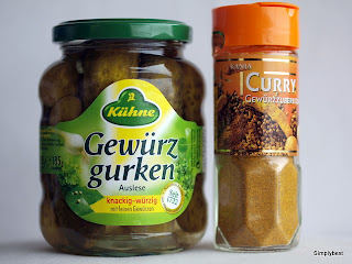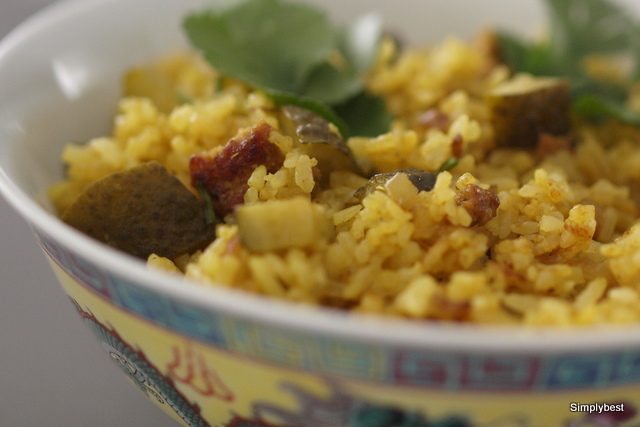 Here is my version with 'odds and ends' like some pickled gherkins, some mince meat and curry powder. The curry powder in this instance is not spicy as it's a european adapted mixture. It has high percentage of kukurma and has hardly any bite of spicyness but it gives the rice a happy yellow tinge. Even suitable for young children.