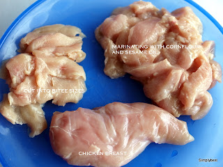 1 tsp cornflour+1 tsp sesame oil+1tsp shaoxing wine or sherry for 10 minutes