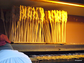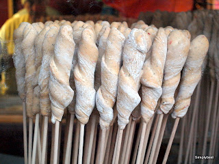 The bread dough is wrapped around a stick