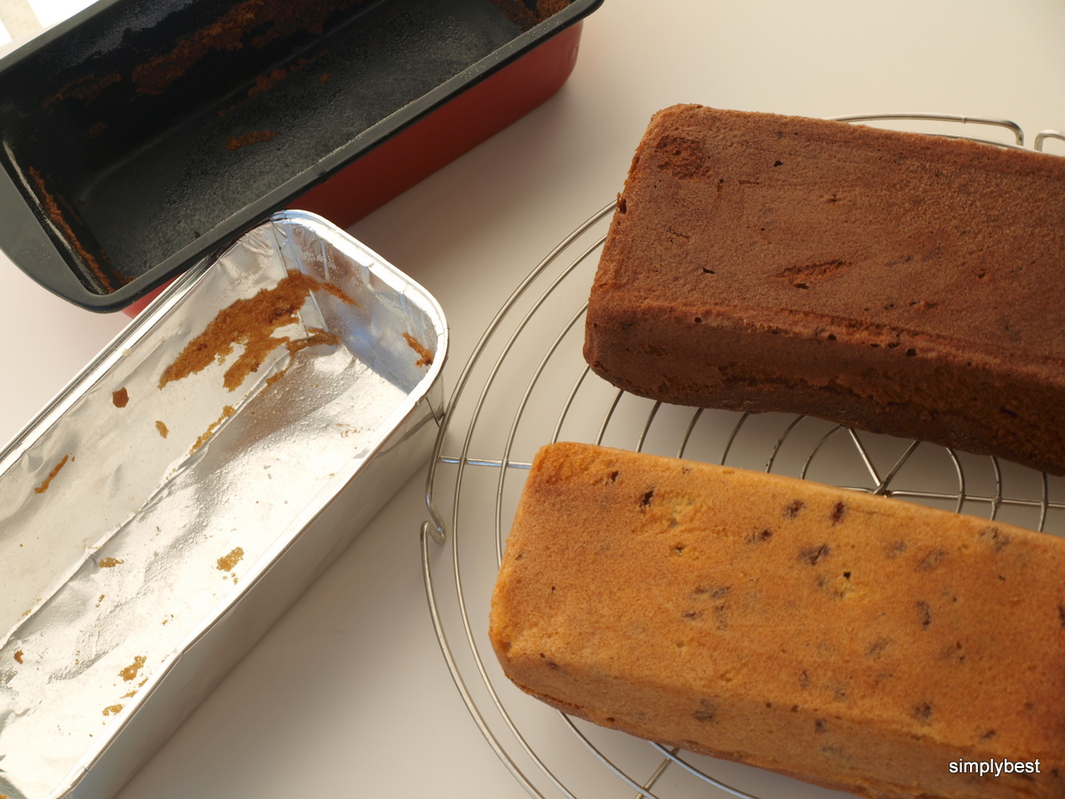 Look at the difference - One is a metal loaf pan and the other an aluminium throw-away. They were baked together, placed side by side. The darker result was baked in metal loaf pan.