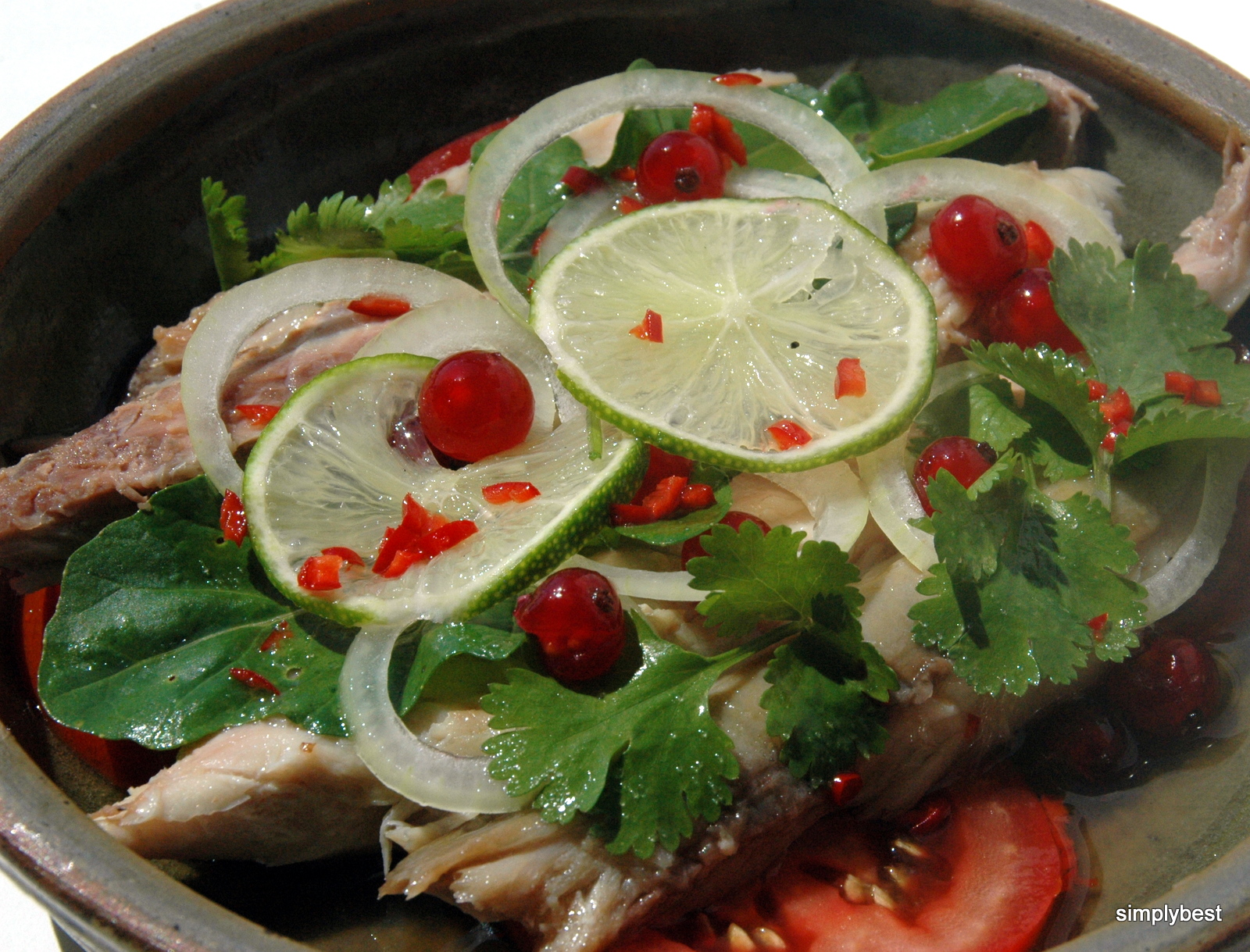 Place fish, onions, coriander/rocket salad alternately over tomato.
