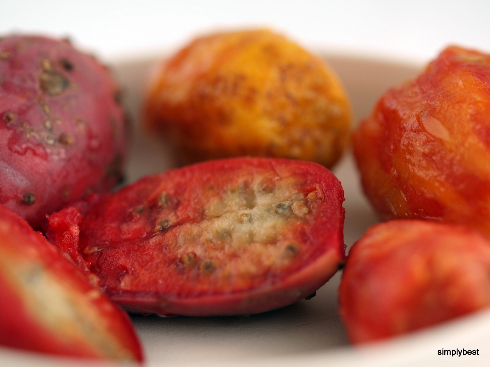 If you've never eaten cactus fruit (prickly pear)before, you must have a try. I must admit, it is an acquired taste but not unpleasant. In my opinion, it is a mix of melon and pineapple. The fruit is as big as a duck egg with thick coarse skin with tiny prickly spines which can be very irritating when stuck in bare hands. The fruit flesh ranges in colour from yellow to orange, or dark burgundy which makes it good for cocktails.