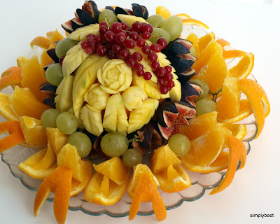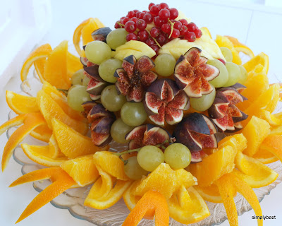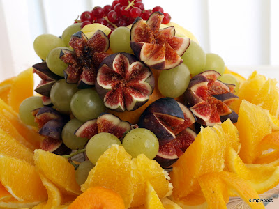 This bouquet consist of figs, mango, grapes and oranges, crowned with red currants.