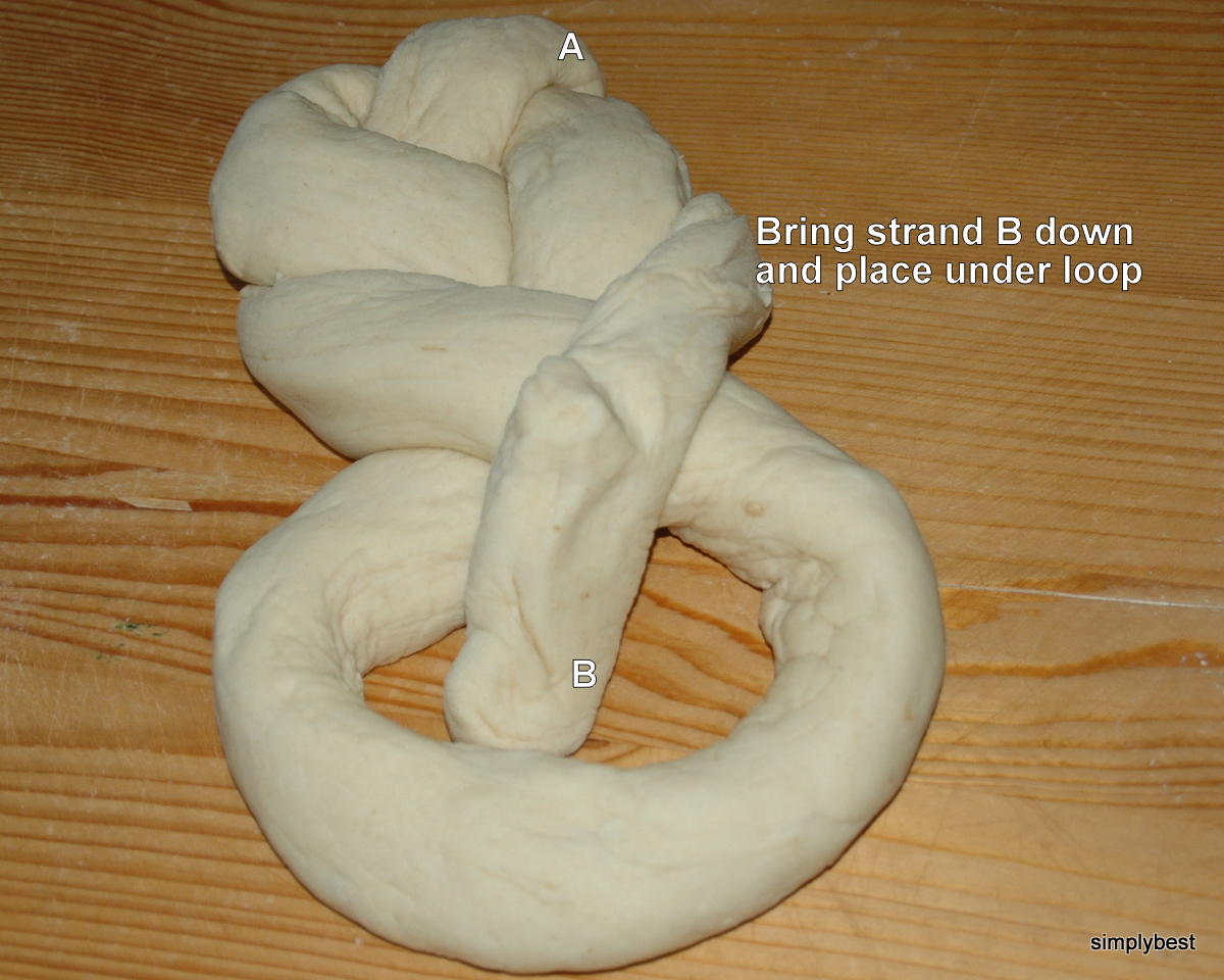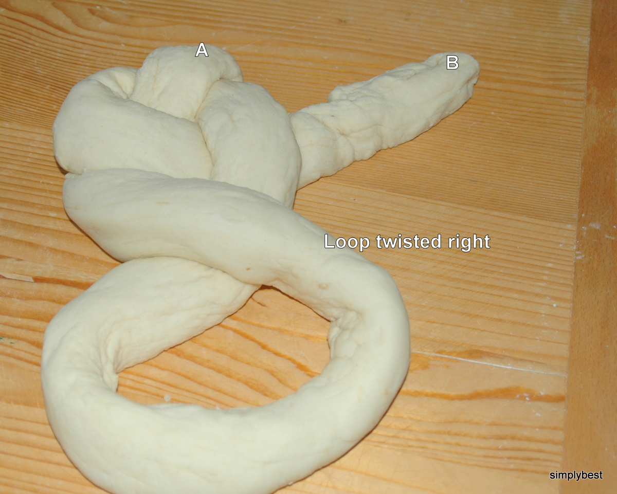 Nearly every european country has it's own version of braids. 3 strands, 4 strands, button knots, rose knots etc. After watching a video Lily sent me, I had to make this single strand braid. It looked so simple. Using only 1 long strand of dough and in 4 steps the lady made a beautiful perfect braid. Ha ! I was soooo wrong. Confirmed! . Just watching the steps is not enough. LEARNING BY DOING !