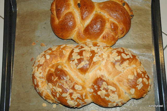 9.Brush braids with eggwash. I sprinkled the kilo braid with almond flakes.