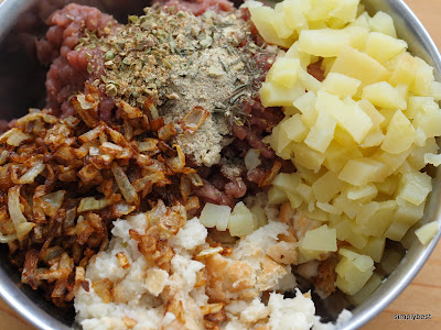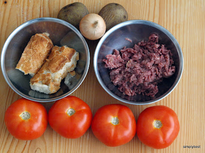 Some mince meat, old bread, cooked potatoes and a large onion.