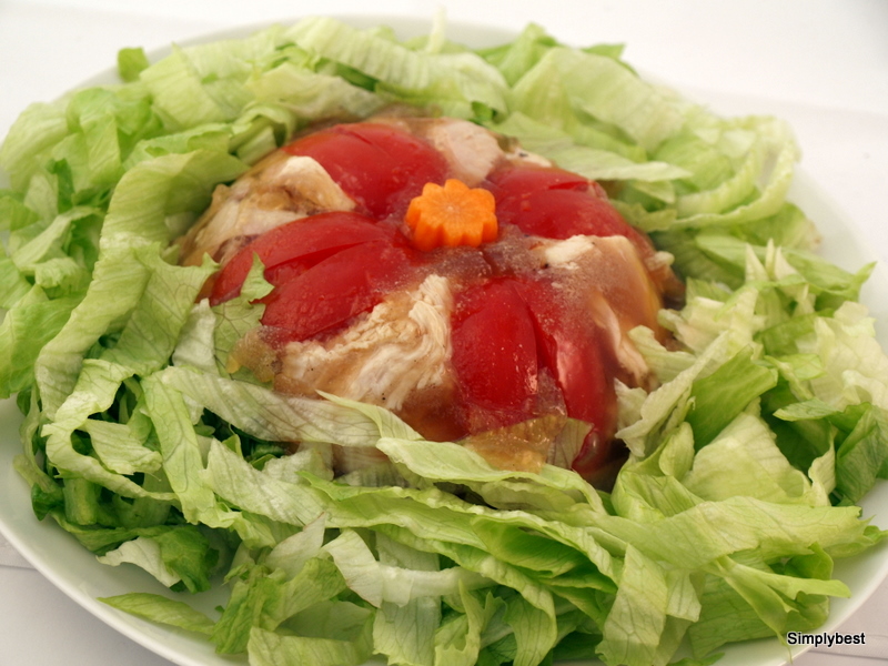 Baked chicken, deboned and shredded. Arranged in a deep bowl with tomato and crunchy pickled gherkins and then smoothered in own juice which was flavoured with wine and vinegar.
